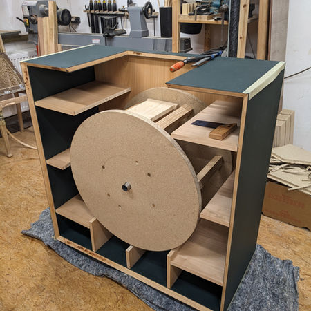 Ein Magazinmöbel für kreative Arbeit mit zentraler beweglicher Massivholzscheibe. Diese ist bildhauerisch ausgearbeitet.